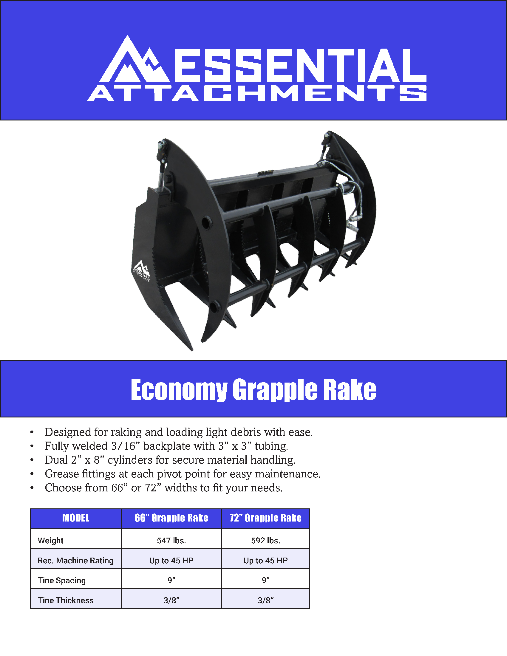 - 3/8″ Thick Tines spaced every 9″